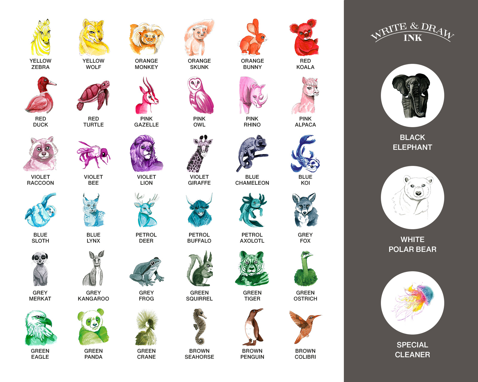 Die Besonderheit der insgesamt 38 Farben wasserbasierten Write & Draw Schreib- und Zeichentinten ist, dass diese pigmentiert sind. Zudem trocknen diese wasser- und wischfest ab.