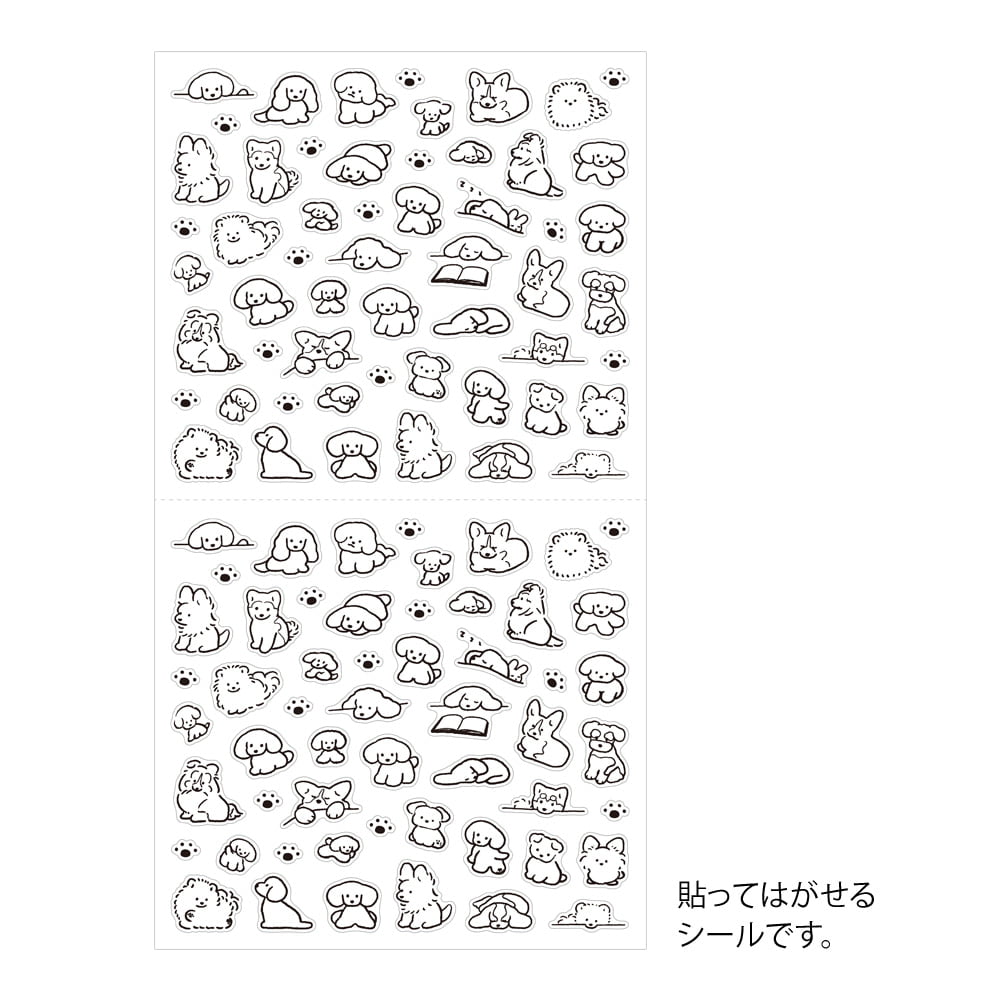 Du bekommt einen Stickerbogen mit schwarz weißen Hunden auf matt halb transparentem Papier.