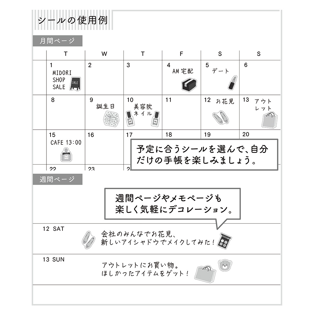 Du bekommt einen Stickerbogen mit farbigen Sopping Aufklebern auf matt halb transparentem Papier.