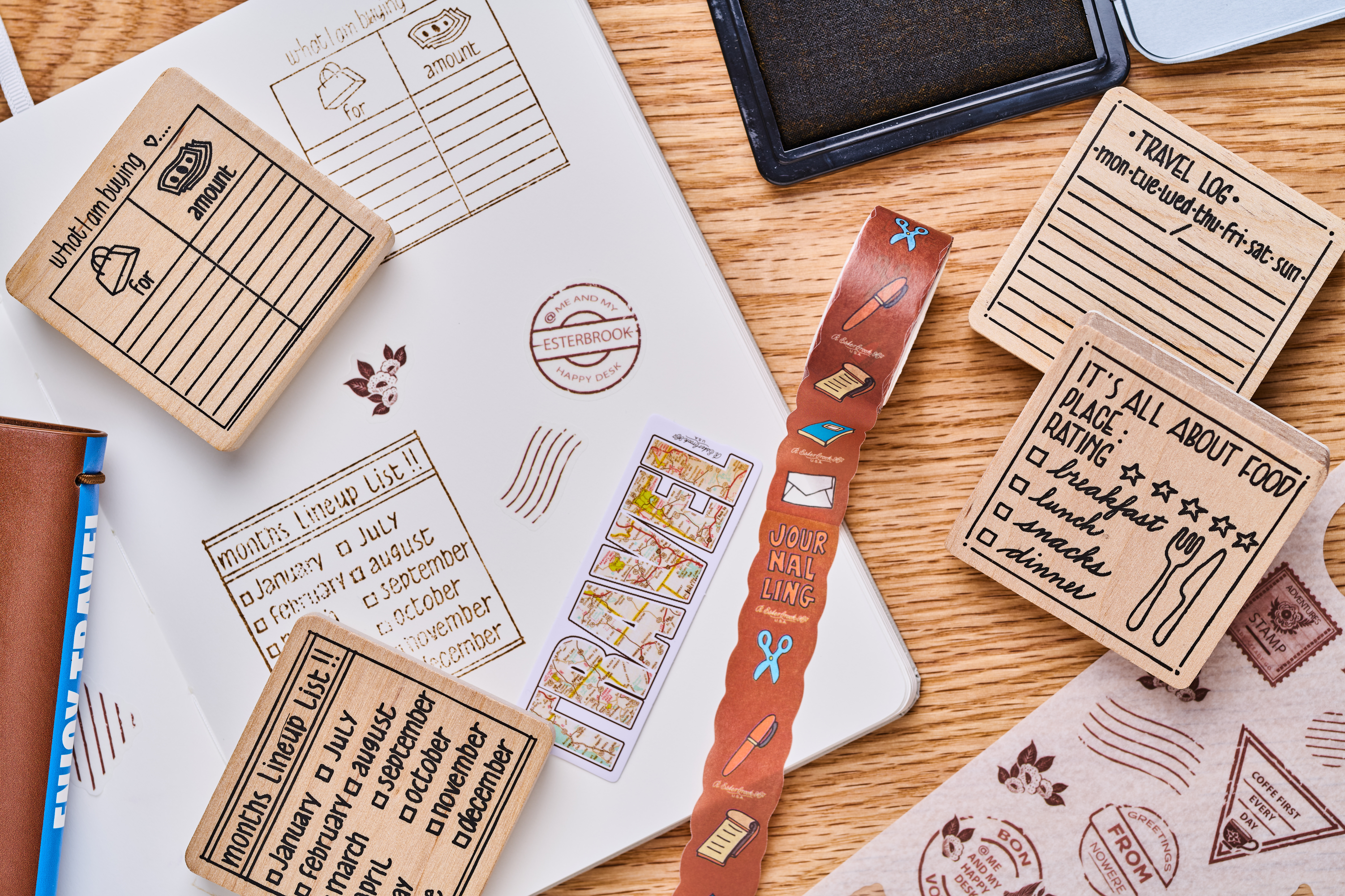 Individuelle Holzstempel mit Reisemotiven zum Markieren von Mahlzeiten, Einkäufen oder Reiserouten sowie ein Stempelkissen mit dem Esterbrook-Vintage-Logo.