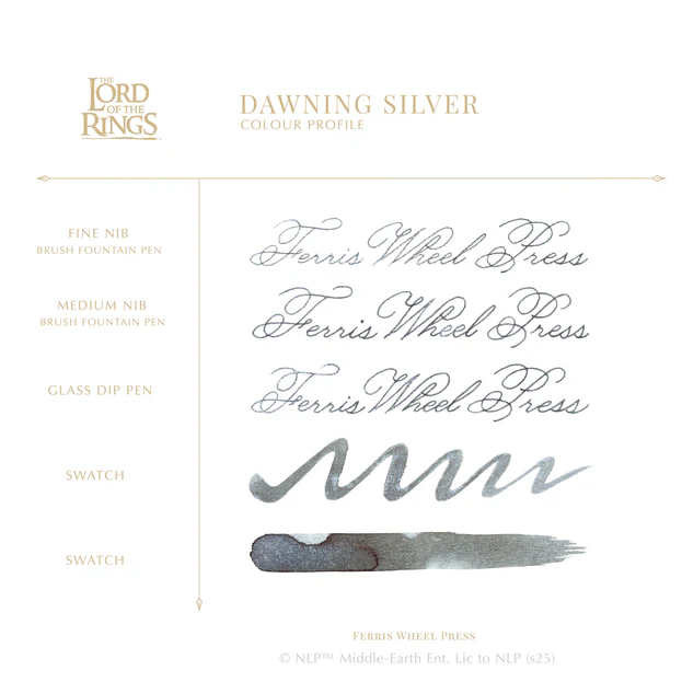 Warner Bros. Discovery license product – An exquisitely crafted fountain pen ink collection inspired by the rich landscapes and epic battles of Middle-earth. From the lush Verdant Voyage green, evoking the rolling hills of the Shire, to the solemn Dawning Silver, capturing the stormy skies over Helm’s Deep™, and the fiery Shadows of Mordor™, mirroring the molten depths of Mount Doom™—these shimmering inks are designed to bring your writing to life with depth and brilliance. Explore and collect all three!