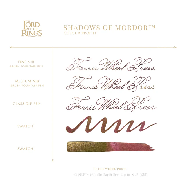 Warner Bros. Discovery license product – An exquisitely crafted fountain pen ink collection inspired by the rich landscapes and epic battles of Middle-earth. From the lush Verdant Voyage green, evoking the rolling hills of the Shire, to the solemn Dawning Silver, capturing the stormy skies over Helm’s Deep™, and the fiery Shadows of Mordor™, mirroring the molten depths of Mount Doom™—these shimmering inks are designed to bring your writing to life with depth and brilliance. Explore and collect all three!
