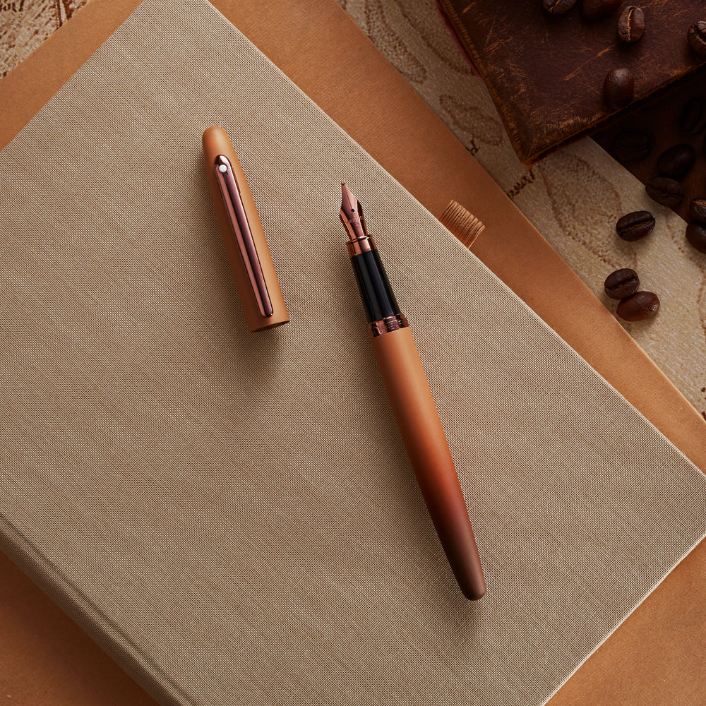 The Sheaffer VFM Coffee Edition, featuring a light coffee brown finish and a charming cup and heart insignia printed on the back. Tailored for coffee lovers with a flair for writing, this special edition pen combines sleek design with stylish practicality, making it an ideal companion for everyday use.